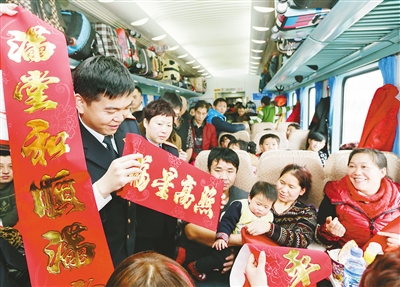 2月2日,在由上海南站发往贵阳的K4249次列车上,上海客运段的工作人员用有奖竞猜、送福字等方式与旅客互动,送上新春的祝福。 新华社记者 丁 汀 摄 |