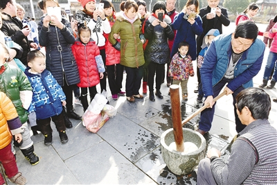 | 2月2日,婺源县江湾村村民在村头打麻糍。当日是农历大年二十四,也是南方地区的小年。江西婺源县江湾村年味渐浓,村民杀年猪、摆夜饭、打麻糍、压米糖、爆米花,迎接猴年春节的到来。新华社记者 宋振平 摄 |
