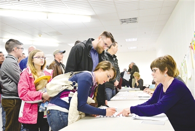 2月1日,在美国艾奥瓦州首府得梅因的一个投票点,人们排队登记参加预选。 当日,美国两党首场总统预选在艾奥瓦州举行,拉开2016年美国总统选举的序幕。 新华社记者 殷博古 摄