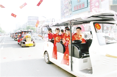 4月30日上午,天高云淡,风和日丽,12对新人在结束了化妆、更衣之后,乘坐10辆古色古香的敞篷花车开始了全城巡游。一路上,新人引得市民纷纷围观拍照。有市民感叹道:“现在的孩子真幸福啊!婚礼有这么新颖的方式,还体现了咱们国家的传统文化。”上午10点整,中式婚典正式开始。在庄重典雅的古风雅乐中,12名侍女引领新人依次入场,让现场市民感受到了浓郁的古典婚俗文化。在随后的抽奖环节中,有一对新人喜获一万零一元的老庙银楼钻戒一枚,两对新人获赠价值3200元的大礼包,其他新人分别获得了主办方赠送的新婚礼品。