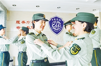 5月1日,石家庄边防检查站穿着佩戴新式标志服装的检查员在执勤之前相互整理警容。根据武警部队编制体制调整改革总体安排,武警各部队5月1日起统一佩戴新式标志、服饰。新华社发