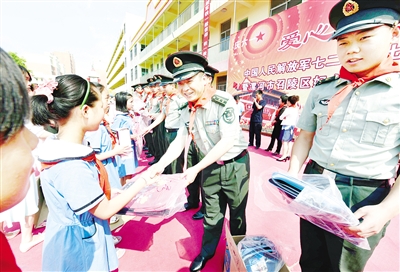 5月30日,召陵区召陵镇实验小学校园里洋溢着节日的欢快气氛,驻漯某部官兵来到这里,帮该校63名困难留守儿童实现“微心愿”。召陵区妇女联合会当日也为该校的40名特困留守儿童发放了救助金和慰问品。