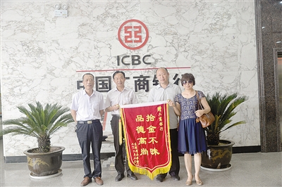6月6日,工商银行漯河分行安保人员夜间巡查时,捡到一棕色挎包,内有身份证、银行卡、医保卡、大额存单及欠条账本等物品,经多方沟通,与失主取得联系,并将挎包归还失主。6月8日,客户送来锦旗,对银行员工拾金不昧行为表示感谢。樊艳波 摄
