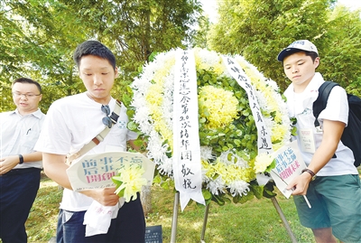 8月15日,日本友人代表在和平集会上向南京大屠杀遇难者献花圈。当日,在抗日战争胜利71周年之际,包括南京大屠杀幸存者代表、日本“神户·南京心连心会”第20次访华团成员在内的中日韩三国数十名代表在侵华日军南京大屠杀遇难同胞纪念馆内的和平公园举行国际和平集会等活动,悼念南京大屠杀30万遇难者。新华社记者 孙 参 摄