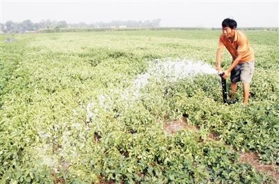 8月24日,召陵区老窝镇楚庄村农民在为花生浇水。入秋以来,我市高温少雨,农民群众采取多项措施抗旱保秋。本报记者 范子恒 摄