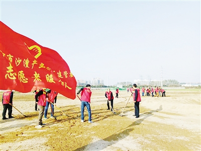 近日,沙澧产业集聚区建管委开展了“学习系列讲话、推动建功立业,以学促做、务求实效,做合格党员”的“两学一做”主题党日活动,组织党员志愿者围绕全区重点工作开展志愿者服务活动。图为志愿者在沙澧产业集聚区秋季重点开工项目之一的大参林医药产业园开展服务活动。吴继红 摄
