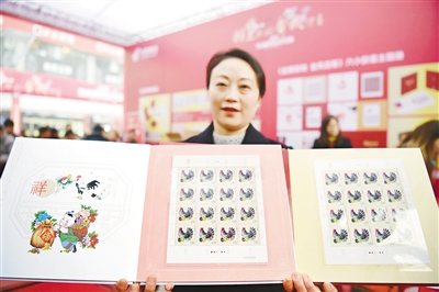 1月5日,工作人员在重庆杨家坪步行街举行的首发仪式上展示鸡年特种邮票《丁酉年》。当日,中国邮政发行《丁酉年》生肖特种邮票一套两枚,由著名艺术家韩美林创作,分别为“意气风发”和“丁酉大吉”,全套邮票面值2.40元。