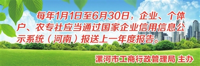 信息公示及信用监管相关法律法规,强化企业信用监管。从今天起,本报将陆续刊登指导企业年报工作及信用惩戒、协同监管等相关依据及案例,引导企业注重信息公示、积累信用资本、树立良好形象、服务企业发展、维护交易安全、营造良好环境,促进我市经济又好又快发展。 王永红