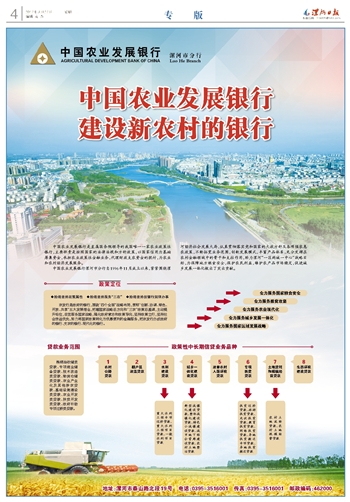 中国农业发展银行漯河市分行自1996年11月成立以来,紧紧围绕漯河经济社会发展大局,认真贯彻落实党和国家的大政方针及各项强农惠农政策,不断拓宽业务范围,创新发展模式,丰富产品体系,充分发挥在农村金融领域中的骨干和支柱作用,助力漯河“一区两城一中心”战略目标,为保障地方粮食安全,保护农民利益,维护农产品市场稳定,促进城乡发展一体化做出了突出贡献。