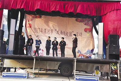 3月28日,“戏曲进校园”活动走进漯河高中,全校师生一同欣赏市豫剧团演员的精彩表演。图为该校学生和演员互动。