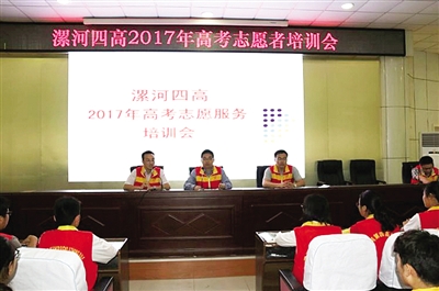 6月4日,漯河四高对参加今年高考志愿服务的70多名学生进行培训,要求所有志愿者按时到位、听从指挥、精心服务、助力高考。