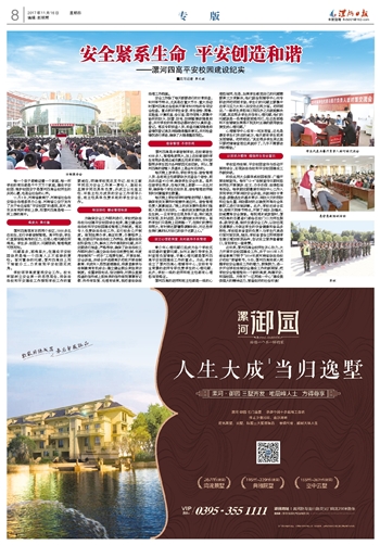 11月2日,河南省教育厅、河南省社会治安综合治理委员办公室、河南省公安厅发布了关于命名省级“平安校园”的通报,其中,我市共有两所学校上榜,而漯河四高是唯一一所上榜的高中。