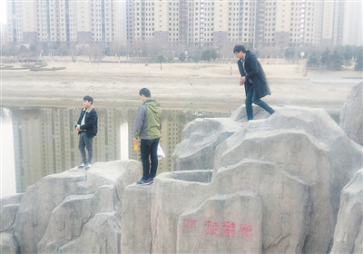 元旦假期,几名青年在沙澧河风景区违规攀爬假山。
