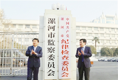 本报讯(记者 李 丹)1月15日上午,漯河市监察委员会挂牌。这标志着我市监察体制改革取得了新成果。市委书记、市深化监察体制改革试点工作小组组长蒿慧杰,市人大常委会主任曹存正共同为市监察委员会挂牌。市委常委、市纪委书记、市监察委员会主任杨骁出席。市纪委、监委工作人员一起见证了这一庄严时刻。