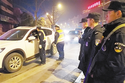 为全面净化社会治安环境,强力推进“平安守护”专项行动深入开展,1月19日晚,我市公安机关集结300多名公安民警和特警队员,分别在源汇区干河陈乡丁湾村和漯河火车站、汽车站附近区域开展大规模“平安夜查”集中行动。本报记者 薛宏冰 摄