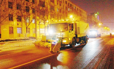 1月27日晚10时,环卫部门的清雪车还在汉江路上清理积雪。本报记者 范子恒 摄