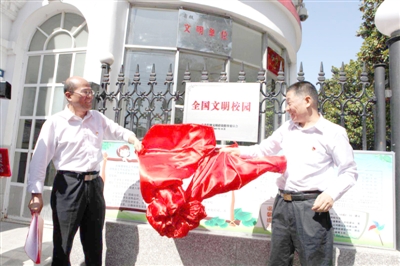 5月3日上午,漯河小学“全国文明校园”揭牌仪式举行。五月的漯河小学春意盎然,校园环境整洁雅致,到处花香四溢。置身漯河小学,文明犹如清风,虽无形,但无处不在;又如春雨,虽无声,却沁人心脾。
