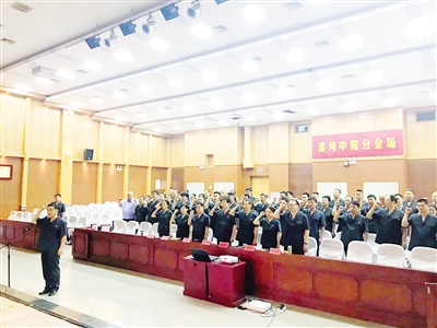 6月29日上午,市中级人民法院党组书记、院长陈松林给全体党员法官上了一堂以“不忘初心,牢记使命”为主题的党课,该院党员干警又重温了入党誓词。本报记者 薛宏冰 摄