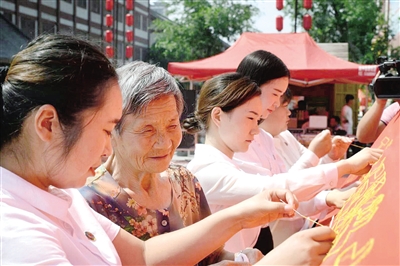 图① 为庆祝建党97周年,6月29日上午,在河上街景区受降亭广场,源汇区干河陈乡干河陈村隆重举行纪念活动,党员、少先队员、志愿者、群众代表等分批来到绣架前,在鲜艳的红旗上绣出“干河陈村永远跟党走”九个大字。本报记者 姚 肖 摄 ① |
