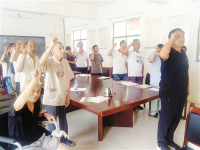 图③ 7月1日,舞阳县吴城镇英张村年逾九旬的老党员王庆云(左一)坐着轮椅,郑重地举起右手,重温入党誓词。 王庆云生于1927年,1951年参加中国人民志愿军并加入中国共产党。老人前段时间曾摔倒致腿部骨折,但他主动提出要求,坐着轮椅参加了村党支部举行的纪念建党97周年活动。 张纪东 摄 ③ |