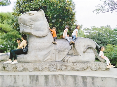国庆节期间,在老虎滩公园,市民攀爬塑像。