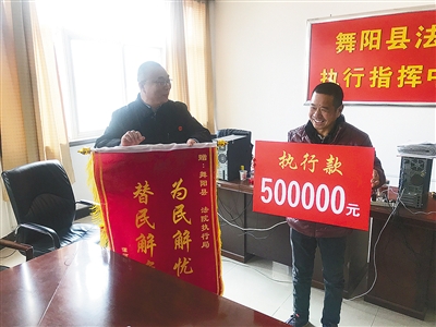 时间来到2018年的12月16日,距离2018年结束还有15天的时间。这一年,舞阳县人民法院执行工作的开展情况怎么样? 不久前,该院公布了一组执行数据:自2018年5月1日开展“百日执行攻坚”专项活动以来,该院共立执行案件504件,执结277件,实际到位金额29506896.18元,清理超长期案件233件,终本案件合格率为100%。记者注意到,该院自12月初开展的“暖冬行动”专项执行攻坚战成绩格外亮眼。共出动警力400余人次,采取冻结、查封、扣押等强制措施100 余次,执结案件48件,执行到位金额520余万元,其中涉民生案件7件,标的120余万元。 为进一步了解该院的执行工作,12月14日,记者跟随市中级人民法院执行局干警到舞阳县人民法院一起见证执行。 4小时拘传8名失信人 12月14日,天阴沉沉的,寒风刺骨,但我市两级法院“暖冬行动”专项执行攻坚战的力度不减。 上午7时许,市中级人民法院和舞阳县人民法院30余名干警已经集合完毕,举行短暂的动员仪式。全体干警高举右手,在舞阳县人民法院执行局局长王联合的带领下有力地喊着“必胜!必胜!必胜!”。 随后,按照事先制订的执行路线,全体干警兵分两路向失信被执行人所在地再次出发。 警车在舞阳县城穿梭,到了南京路,拐进一个小巷,在小巷的尽头停下。数十名干警迅速行动,敲开了巷子口一处紧闭的大门。面对执行干警的突袭,夏某显得很平静地说:“真躲不了的!中,我跟你们走!” 接下来的执行行动进展也很顺利,从南京路到贾湖文化广场再到莲花镇、太尉镇、保和乡、姜店乡等地,一路进展都很顺利,没有印象中的爬墙、撬门等强制执行手段,所到之处被执行人都很配合,跟随执行人员到法院。 在文峰乡段庄村被执行人家人对执行依然不理解,干警及时对其进行释法明理。一路释法明理,一路强制拘传。截至当天上午11点,共拘传失信被执行人8名。 “可能大家会觉得行动很顺利,其实真的不是表面的那么简单,之前我们都做了大量的工作,多次与被执行人进行沟通,多次重申不执行法院生效判决、裁定的后果,告诉他们躲避解决不了问题,所以他们才愿意配合。”王联合解释道。 据悉,经过进一步释法明理,截至当日12点,拘传的8人中,有6人同申请人达成了执行和解。历经磨难为农民工讨薪50万 “为民解忧,替民解难!谢谢法院!”12月14日上午11点30分,舞阳县的农民工代表葛某一手将一面饱含谢意的锦旗递交给舞阳县人民法院执行局局长王联合,一手从王联合手中接过50万元的执行款,笑意溢满了嘴角。 这是一起农民工合同纠纷案。几年前,某建设工程公司与葛某签订建设工程清包工程合同,工程完工后,某建设工程公司拖欠葛某工程款380多万。该案经法院审理,判决某建设工程公司支付葛某工程款及利息384万元。 判决生效后,某建设工程公司对法院的生效判决置之不理,今年9月,数百名农民工不得不申请法院强制执行。在此后时间里,舞阳县人民法院执行局干警一次次地和被执行人联系,并积极查询其财产状况。辗转信阳、漯河市区等地多次调查,冻结某建设工程公司60万元。几经调查,查询到某建设工程公司在山东菏泽也有工程,经过核实后发现,该工程目前尚有造价1亿多的项目正在运行中。 但在执行的过程中,干警也注意到,如果一次性将384万余元的执行款进行扣完,确实可以一劳永逸的一次性执结案件。但势必会对某建设工程公司造成影响。 “执行的最终目的,是让人生存,维护当事人的合法权益,但也不能把被执行企业逼上绝路,也得让它生存下去。”王联合告诉记者,出于既保护民营企业发展、又维护农民工权益的目的,该局采取让这家建设工程公司分期支付工程款的办法,先只执结了一部分执行款。 “民生无小事,事事总关情。”岁末寒冬、年关将至,涉民生案件更加牵动着法院人员的心。舞阳县人民法院以开展“冬季攻坚之暖冬行动”专项执行攻坚战为契机加大涉民生案件的执行力度,坚持每周六常态化执行,加大对涉农民工工资、赡养费、扶养费、抚育费、抚恤金、交通事故人身伤害赔偿等涉民生案件的执行力度,采取罚款、拘留等强制措施和失信曝光惩戒力度,快速执结大批涉民生案件,切实维护广大群众的合法权益。