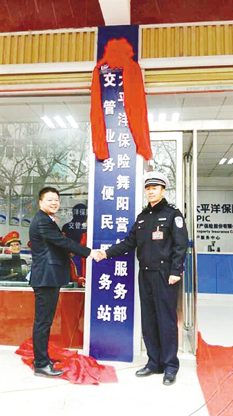 本报讯(记者 孙永辉)日前,中国太平洋财产保险股份有限公司漯河中心支公司分别在临颍、舞阳设立的交管业务便民服务站同时启用。