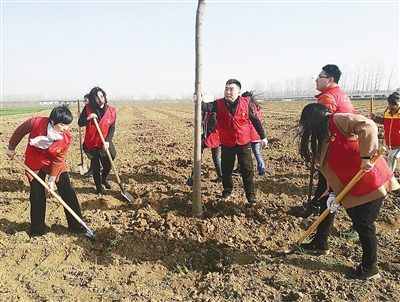 3月12日,郾城区直单位百余名志愿者在孟庙镇义务植树点开展植树活动。