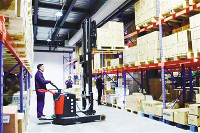 在存放整货的高架储货区,环保无污染的电动叉车可对储量大、流转快的药品进行及时码放,便捷、安全、效率高。