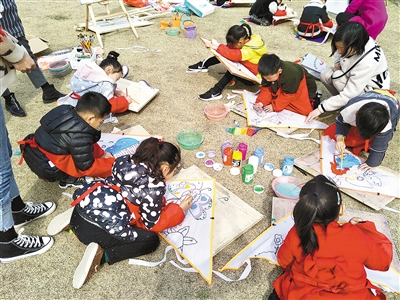 3月23日,一群幼儿园的孩子在老师的指导下在风筝上作画,期待自己亲手绘制的风筝飞上蓝天。 本报记者 胡鸿丽 摄