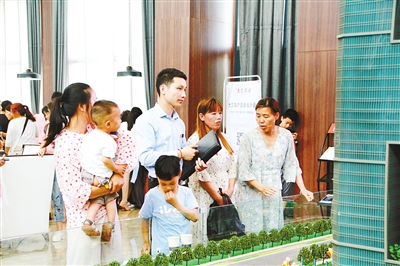 6月1日,荣昌·大道东方三期新品亮相发布会暨公益助学活动举办。活动现场,主办方向召陵区拐张小学学生捐助了246个爱心书包。图为销售人员向参会嘉宾介绍新楼盘概况。本报记者 范子恒 摄