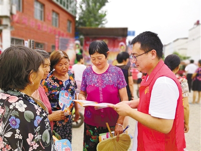 近日,召陵区纪委监委、区文化旅游局、区司法局、区农村信用联社联合举办“幸福召陵”群众文化演出活动。图为该区司法局组织律师、普法志愿者在青年镇枯河村发放普法宣传折页和印有法律知识的小扇子。张 莉 摄