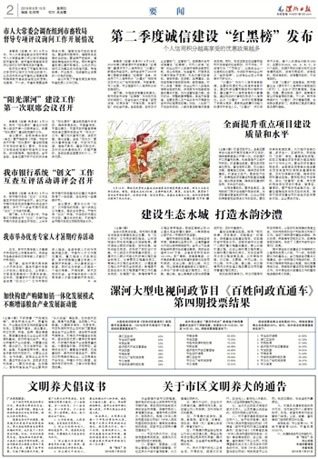生态水系亮点纷呈。将河湖水系建设与修复治理摆在突出位置,与“四水同治”工作同步谋划推进,以河湖相连水网体系构建以水润城格局。淍河湿地公园现状踏勘、资料收集、地形测绘已完成,并形成了规划设计方案。中心城区水网格局基本显现,沙澧河大二期沙河段水利护岸工程已经全部完工,北岸景观工程基本完工,南岸土方工程已全部完工,沙澧连通工程土方开挖已全部完成;幸福渠市区段生态水系工程渠道开挖工作已基本完成,五福园广场、幸福湖等节点工程正有序推进;西城区高铁以东10公里水系全部蓄水通航,小南湖湿地公园于五一节期间开放运营。