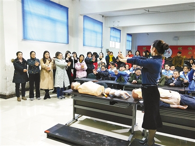 11月30日,市第三人民医院医生到我市外国语中学举行“紧急救护知识进校园”活动。本报记者 李文姣 摄
