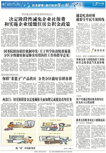 会议强调,当前统筹做好疫情防控和经济社会发展工作,一项迫切任务是稳就业。稳就业就必须稳企业。会议确定,一是阶段性减免企业养老、失业、工伤保险单位缴费,以减轻疫情对企业特别是中小微企业的影响,使企业恢复生产后有一个缓冲期。除湖北外各省份,从2月到6月可对中小微企业免征上述三项费用,从2月到4月可对大型企业减半征收;湖北省从2月到6月可对各类参保企业实行免征。同时,6月底前,企业可申请缓缴住房公积金,在此期间对职工因受疫情影响未能正常还款的公积金贷款,不作逾期处理。实施上述政策,充分考虑了社会保险基金结余等情况,可以确保养老金等各项社保待遇按时足额发放。二是突出抓好稳就业这一“六稳”的首要任务。抓紧出台科学分类、切合实际的复工复产防疫指南,指导各地合理确定复工复产条件,取消不必要的保证金。加快落实已出台的财税、金融等支持政策。有针对性做好重点群体就业工作。通过跨区域点对点劳务协作等有序组织农民工返岗,除疫情严重和扩散风险高的地区外,对限制劳动者返岗的不合理规定要坚决纠正。结合脱贫攻坚和当地建设等支持农民工就地就近就业。抓紧制定高校毕业生延期录用报到方案,加大网上招聘力度。支持企业适应群众线上消费需求增加灵活就业岗位。个体工商户是重要就业主体,要抓紧研究出台支持政策。三是保障失业人员基本生活。及时将受疫情影响的就业困难人员纳入就业援助范围,确保失业保险待遇按时足额发放。支持疫情严重地区开发临时公益性岗位,运用失业保险基金向失业人员发放失业补助金。