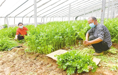 ◀2月25日,商桥镇靳庄村田军种植合作社的工人在蔬菜大棚内收获新鲜蔬菜。该合作社种植的时令蔬菜主要供给市区各个蔬菜市场,保障疫情防控期间“菜篮子”供应。