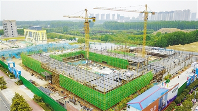 源汇区实验小学分校项目位于柳江路与鹤云山路交叉口西北处,占地面积41.91亩,总投资约1.28亿元,建筑面积2.5万平方米,办学规模36个教学班,可容纳1620名学生就读。图为正在建设中的源汇区实验小学分校项目(摄于5月15日)。