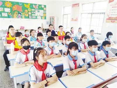 6月30日,源汇区财政局组织志愿者到空冢郭镇中心小学开展“传承红色基因 七一童心向党”活动。图为学生们听志愿者讲述英雄事迹。滕亚平 徐红敏 摄