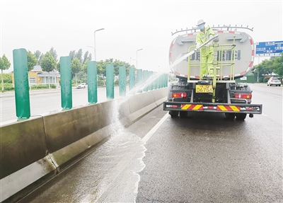 7月27日,市城乡一体化示范区环卫服务中心开展市容整治行动,对辖区内交通隔离带、公交站牌、绿化带等易积尘死角进行冲洗。本报记者 范子恒 摄