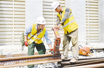 7月28日,施工人员在福州长乐松下站长轨换铺现场作业。 当日,在福建福州长乐松下站建设工地,中铁二十四局施工人员将最后一根长轨换铺到位,标志着国家重点项目福平铁路全线铺轨贯通。 福平铁路是京福高铁的重要延伸段,线路全长约88公里,为时速200公里的Ⅰ级双线铁路。