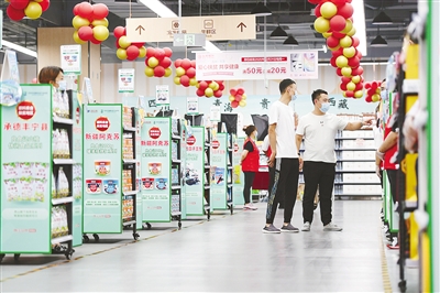 7月28日,顾客在扶贫超市内选购商品。 当日,以销售扶贫产品为特色的首农物美扶贫超市在北京市消费扶贫双创中心开业。据介绍,超市内设置扶贫商品专柜面积1200平方米,主要销售包括北京市扶贫支援的7省区90个县级地区在内的扶贫产品近1000种。 新华社记者 鞠焕宗 摄