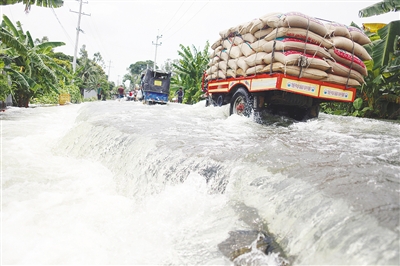 7月27日,在孟加拉国首都达卡附近的蒙希甘杰,货车通过被洪水淹没的路段。 南亚多国正在遭受近年来最严重的一次洪水袭击。新华社发