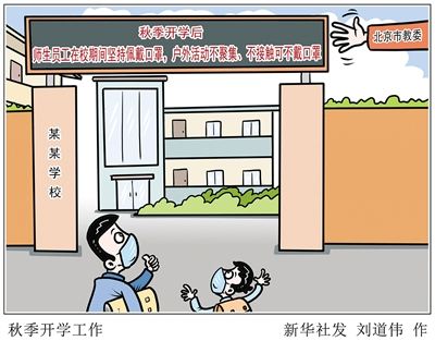 秋季开学后,北京将按照常态化疫情防控措施组织教育教学活动,坚持线上线下相融合的教育供给。大、中、小学师生员工在校期间坚持佩戴口罩,户外活动不聚集、不接触可不戴口罩。新华社发