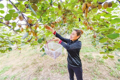 国庆中秋假期,乡村游备受青睐,许多市民走进近郊乡村,在美丽田园中尽享美好时光。图为10月1日,在市城乡一体化示范区黑龙潭镇西街村的猕猴桃种植基地,市民在采摘猕猴桃。本报记者 焦海洋 摄