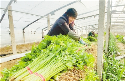村民在大棚里整理收获的芹菜。本报记者 焦海洋 摄