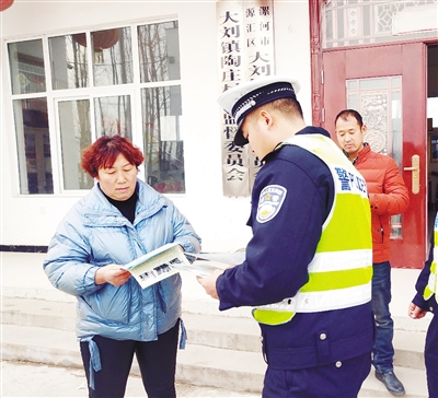 1月3日,市公安局交通管理支队源汇大队民警深入大刘镇陶庄村,对村民进行交通安全宣传教育。王焕丽 摄