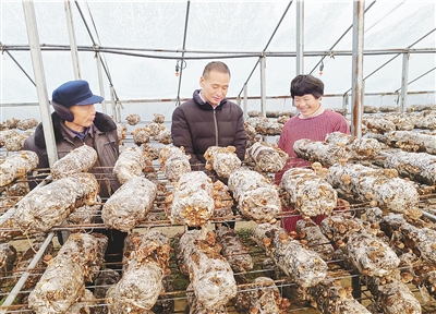 薛大年(中)在香菇产业大棚了解香菇生产销售情况。本报记者 范子恒 摄