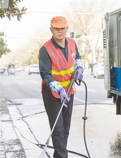 2月9日一大早,李慧田就和工友们在海河路一起用水枪清理路面了。李慧田45岁,老家在河北省保定市,他是我市一家环卫公司的中层干部,负责沙北城区的环卫工作。春节期间,环卫工人实行轮休制度,每天路上只有一半的环卫工人,为了保持街道干净,公司所有中层干部都补充到一线岗位。