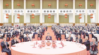 人民大会堂宴会厅灯光璀璨、暖意融融,各界人士约1000人欢聚一堂、共迎新春,欢声笑语间洋溢着喜庆祥和的节日气氛。