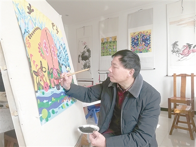 清澈见底的小溪里鱼鸭共嬉,地头歇息的老牛在低头畅饮……2月10日上午,记者到舞阳县农民画协会主席张新亮家里,见到了正在创作农民画的他。“今年是牛年,这幅有关牛的农民画马上完工。”张新亮拿着画笔,为画中的耕牛“点睛”。